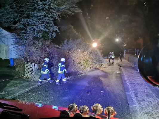 Einsatzbericht Am späten Freitagabend hat des Sturmtief Zeynep zugeschlagen, diesmal ist eine Tanne auf den Schulweg gefallen und musste beseitigt werden. Nach der Alarmierung rückten wir aus und beseitigen die Tanne von der Straße.